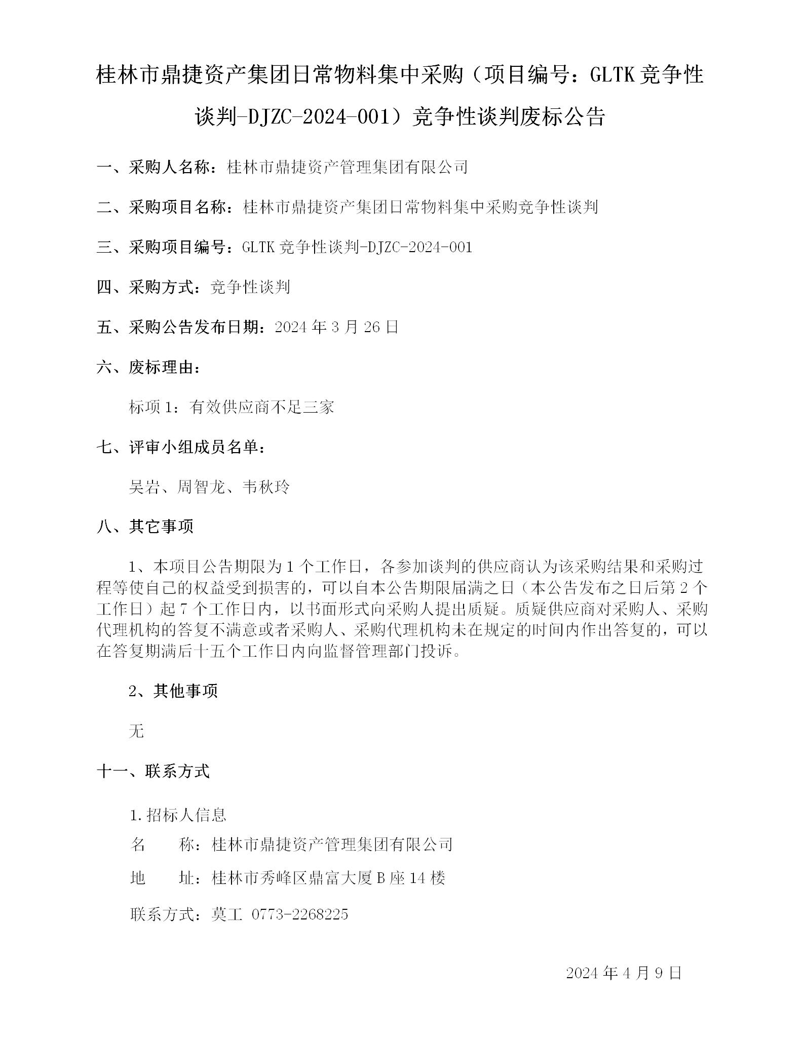 桂林市鼎捷资产集团一样平常物料集中采购(项目编号:GLTK竞争性谈判-DJZC-2024-001)竞争性谈判废标通告