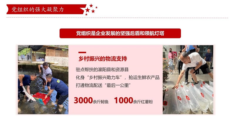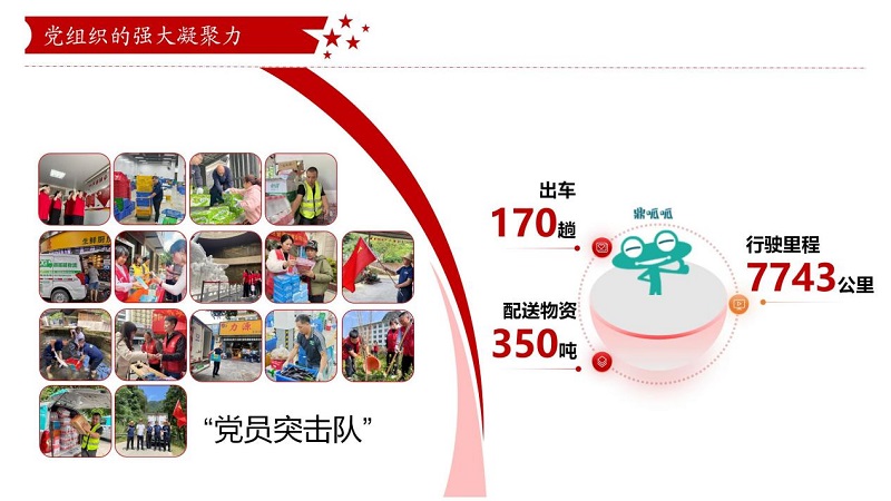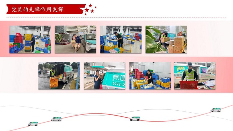 鼎和晟供应链党支部把小组建在车队,,团结向导全体员工冲锋在前、勇挑重担,,在墟落振兴、抗洪救灾等重大使命中形成了强盛的凝聚力和战斗力。。在集团公司驻点帮扶的灌阳县新街镇上甫村,,“鼎呱呱”新能源物流车化身“墟落振兴助力车”,,抢运生鲜农产品,,买通物流配送“最后一公里”;;;在“6·19”特大洪涝灾难中,,鼎和晟供应链秒变“突击队”,,战胜难题配送物资,,让市民喝上“定心水”、吃上“定心菜”,,进一步体现了企业的责任和继续。。